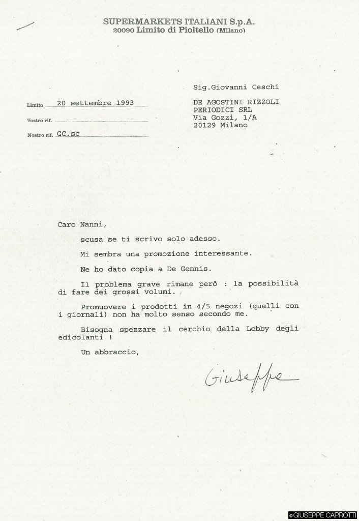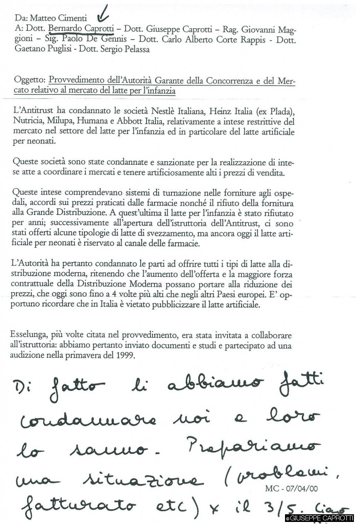 Vedi sotto la nota del ns. responsabile dell’ufficio legale, all’epoca, dottor Matteo Cimenti , indirizzata, con i miei commenti, a Bernardo Caprotti…