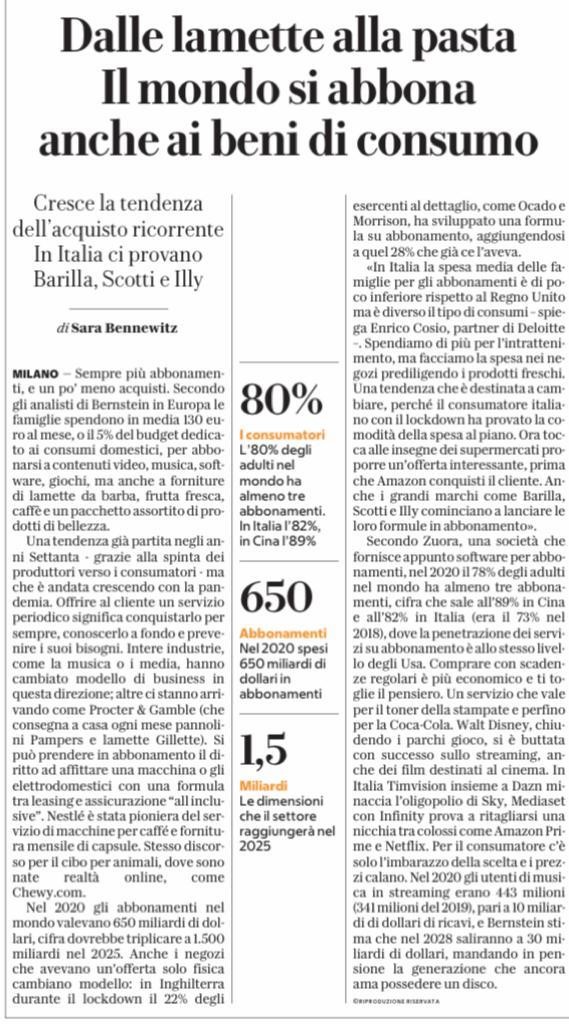 Secondo la Subsciption Trade Association durante il lockdown la moda di comprare forniture periodiche nel mondo è salita a 650 miliardi di dollari nel 2020 tra servizi di intrattenimento e merci, una cifra che nell’arco di cinque anni è destinata a triplicare a 1,5 trilioni nel 2025 con una crescita del 18% all’anno.