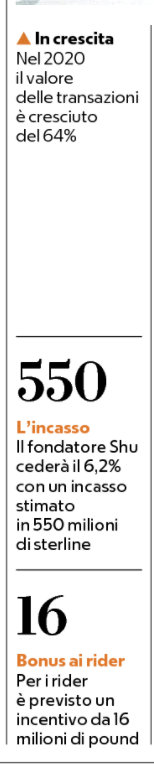 «Diventare una società quotata ci consentirà di investire nell’innovazione – ha detto Shu – sviluppare nuove tecnologie per aiutare ristoranti e drogherie, fornire più lavoro per gli addetti alle consegne ed espandere la scelta dei consumatori». Il gruppo che ha chiuso il 2020 con un valore delle transazioni in aumento del 64% (da 2,5 a 4,1 miliardi di sterline) e una perdita in calo del 29,4% (scesa a 223,7 milioni da un rosso 2019 di 317 milioni di sterline) vede rosa anche per in futuro. «Abbiamo iniziato bene il 2021 – ha detto Shu – vediamo enormi opportunità davanti a noi». L’azienda stima che i settori della ristorazione e dell’alimentare nei 12 Paesi dove opera rappresentano un mercato potenziale di 1.200 miliardi di sterline. Al momento solo il 3% delle vendite – ossia meno di una delle 21 occasioni di pasto settimanali – viene realizzata online.