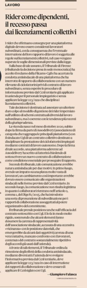 Sulla base di tale assunto, il Tribunale di Firenze (ribaltando la decisione presa in sede monocratica) ha accolto il reclamo della Filcams-Cgil e ha accertato la condotta antisindacale di una piattaforma che ha interrotto il rapporto di collaborazione con un numero rilevante di ciclofattorini privi di contratto di lavoro subordinato, senza esperire le procedure di informazione previste dal Ccnl terziario già applicato in azienda per il personale impiegatizio e senza applicare la legge223/1991 che disciplina i licenziamenti collettivi.
