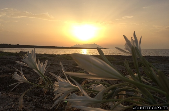 Favignana: i gigli selvatici al tramonto con la vista di Marettimo