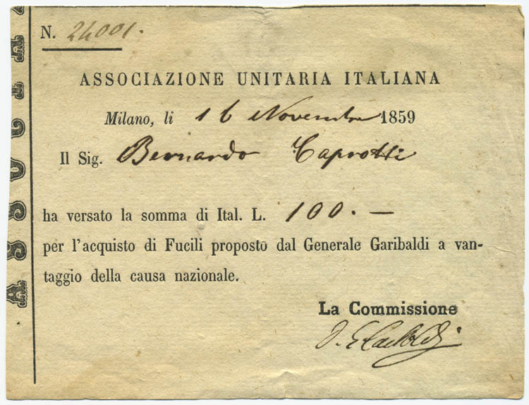 16 novembre 1859 Ricevuta di versamento rilasciata dall’Associazione unitaria italiana a Bernardo Caprotti - mio quadrisnonno- per l’acquisto di fucili proposto dal generale Giuseppe Garibaldi
