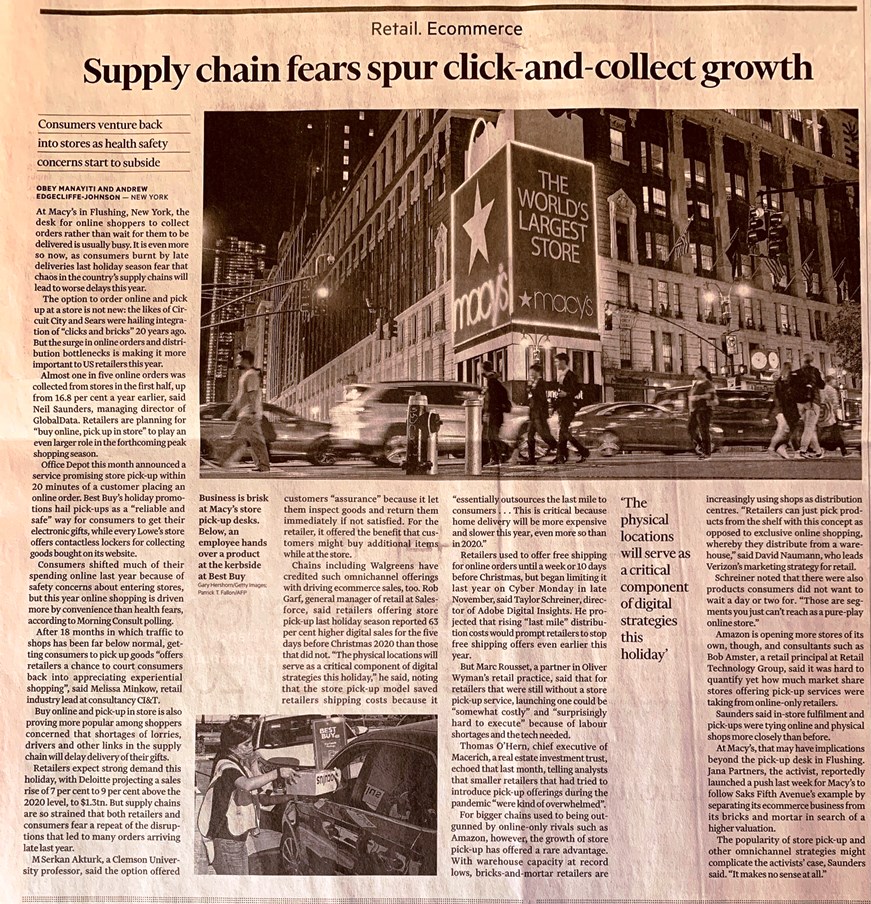 Qualche giorno fa ho riportato questa notizia : “Jana partners LCC (*) ha chiesto al cda di Macy’s (grandi magazzini USA) di separare l’unità e-commerce, che fattura 8 miliardi di $, dal resto dell’azienda” ma ormai un quinto degli ordini online USA vengono consegnati ai clienti nei negozi (vedi il click and collect di Macy’s sopra) rispetto al 16,8% dell’anno scorso.