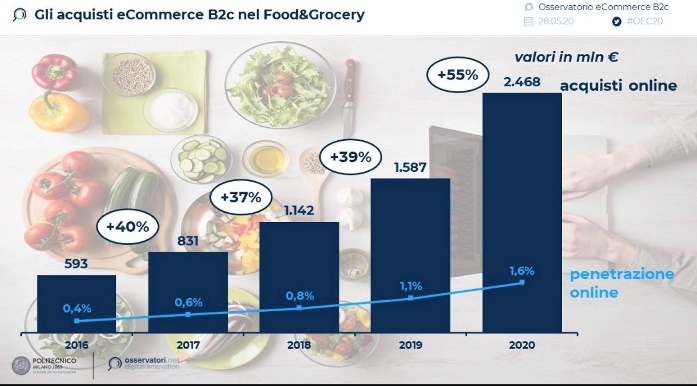 È l’effetto del lockdown che, secondo Osservatorio eCommerce B2c promosso dalla School of Management del Politecnico di Milano e da Netcomm, … i prodotti da supermercato (854 milioni con un +85% sull’anno precedente), quelli di enogastronomia con altri 590 milioni (+63%) e il food delivery con 706 milioni (+19%)”.