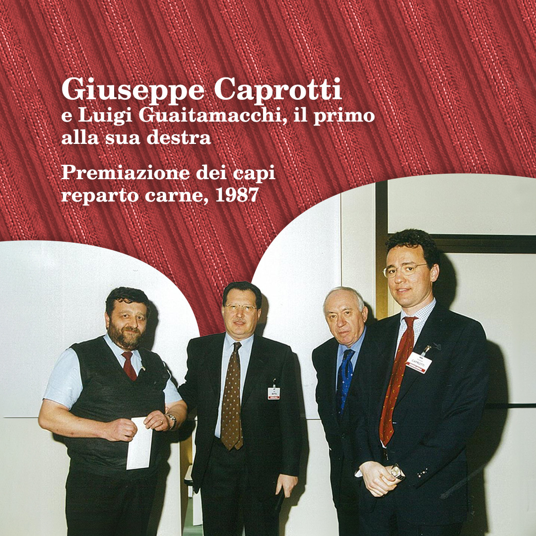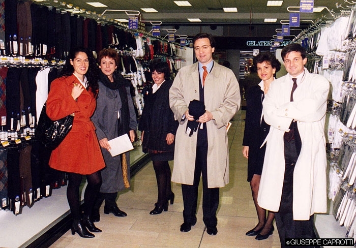 Giuseppe Caprotti con il dottor Puglisi e alcune collaboratrici (dse. Cicco, Mangiola, Cipolla e Camagni) all’apertura del superstore di Corsico nel novembre 1995. Giuseppe ha in mano delle calze da uomo a marchio Esselunga