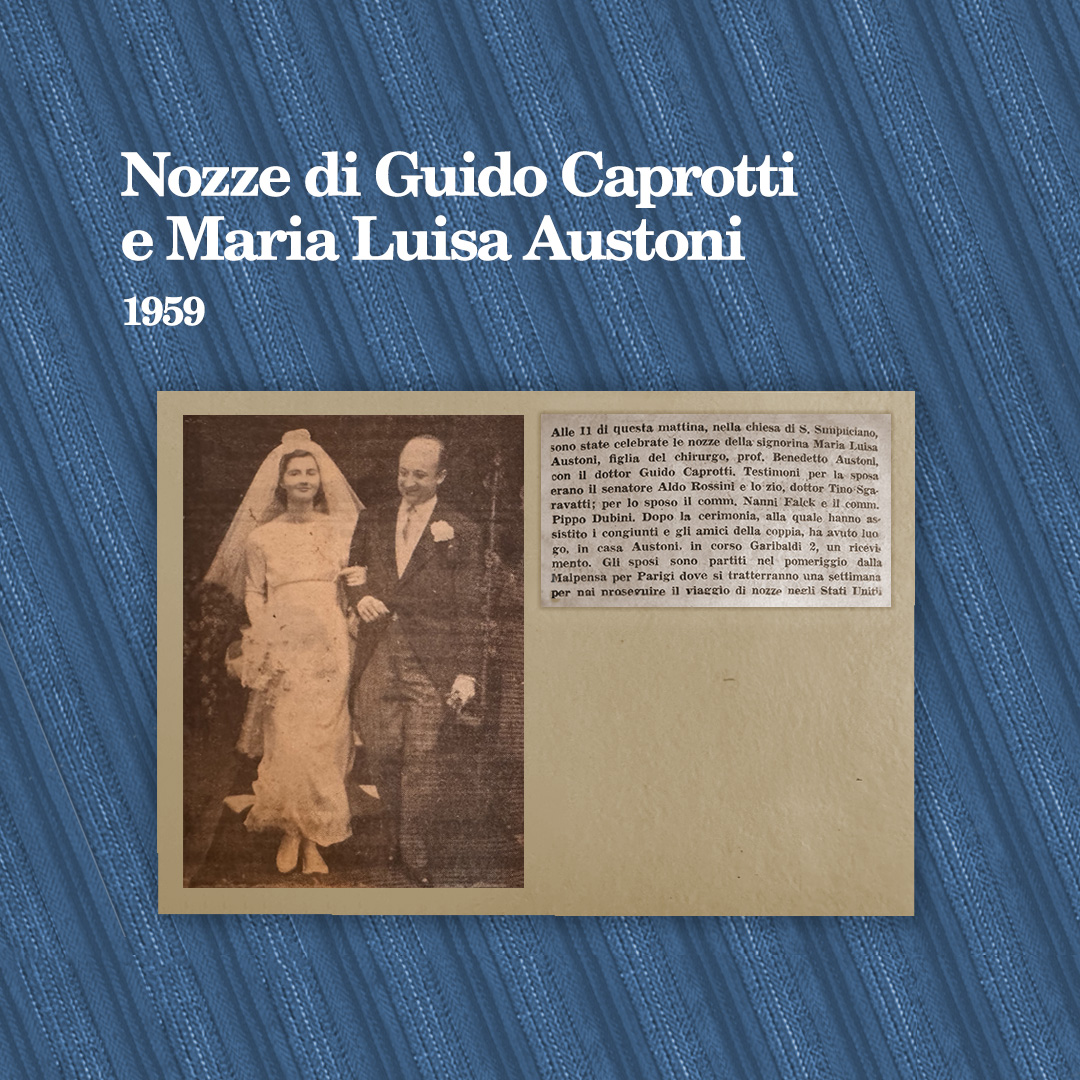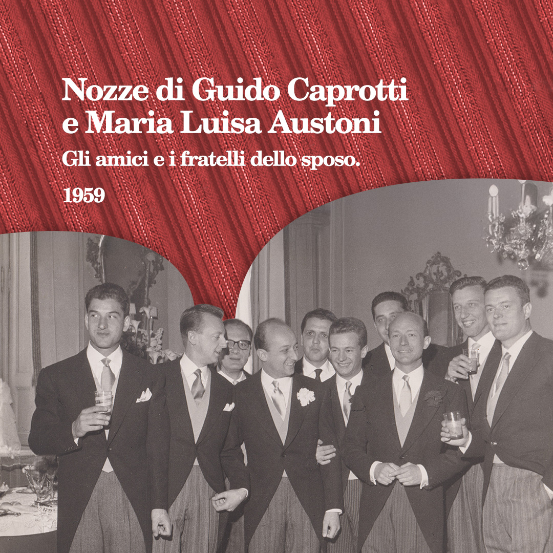 Nozze di Guido Caprotti e Maria Luisa Austoni, 1959: Lo sposo Guido Caprotti al centro con gli amici: da sinistra Antonio Redaelli, Marco Brunelli, Silvano Rezzaghi, Guido Caprotti, Claudio Caprotti, Alberto Fasoli, Puricelli, Luigi Rivolta (sullo sfondo s’intravvede Daniela Vergani).