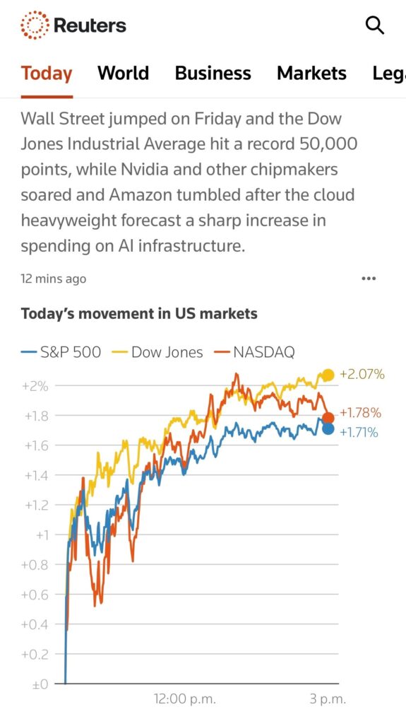 But also Financial Times : Big Tech’s ‘staggering’ $660bn spending reignites fears about artificial intelligence bubble. Stocks tumble despite solid earnings reports from most SiliconValley heavyweights