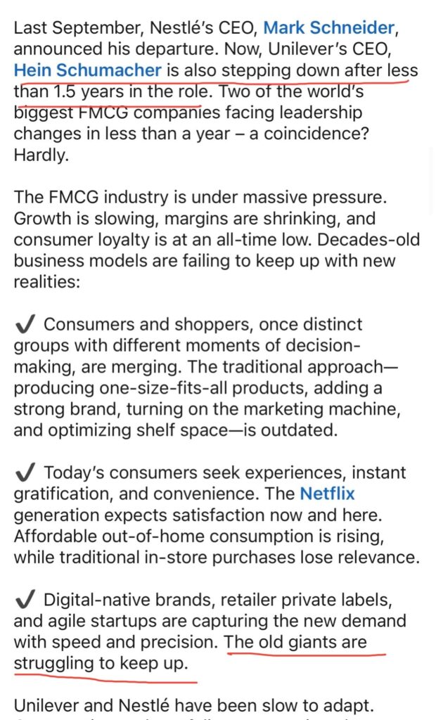 There are those like Dominique Pierre Locher (below his post) who have made the connection between the resignation of Nestlé’s CEO and this changing of the guard (Fernando Fernandez leaves Unilever after one and a half years), prompted by the difficulties of the ‘leading’ brands struggling to adapt to the changing market.