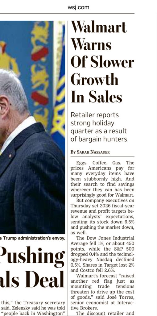 For the fiscal year 2025, Walmart’s sales were $681.0 billion, up 5.1%. Operating income increased by $2.3 billion, or 8.6%, growing faster than sales. The company increased its dividend by 13% to 94 cents per share, its largest increase in more than a decade.. Great e-commerce progression. But Trump’s policies sow uncertainty about the future and a possible slowdown in sales: “Uncertainty about the economic impact of President Donald Trump’s trade policies is dampening expectations for how consumer spending will hold up this year. Just look at Walmart, which today projected that its revenue growth this fiscal year would slow to between 3% and 4%, compared with 5% for the year that ended Jan. 31, 2025″ Theo Wayt