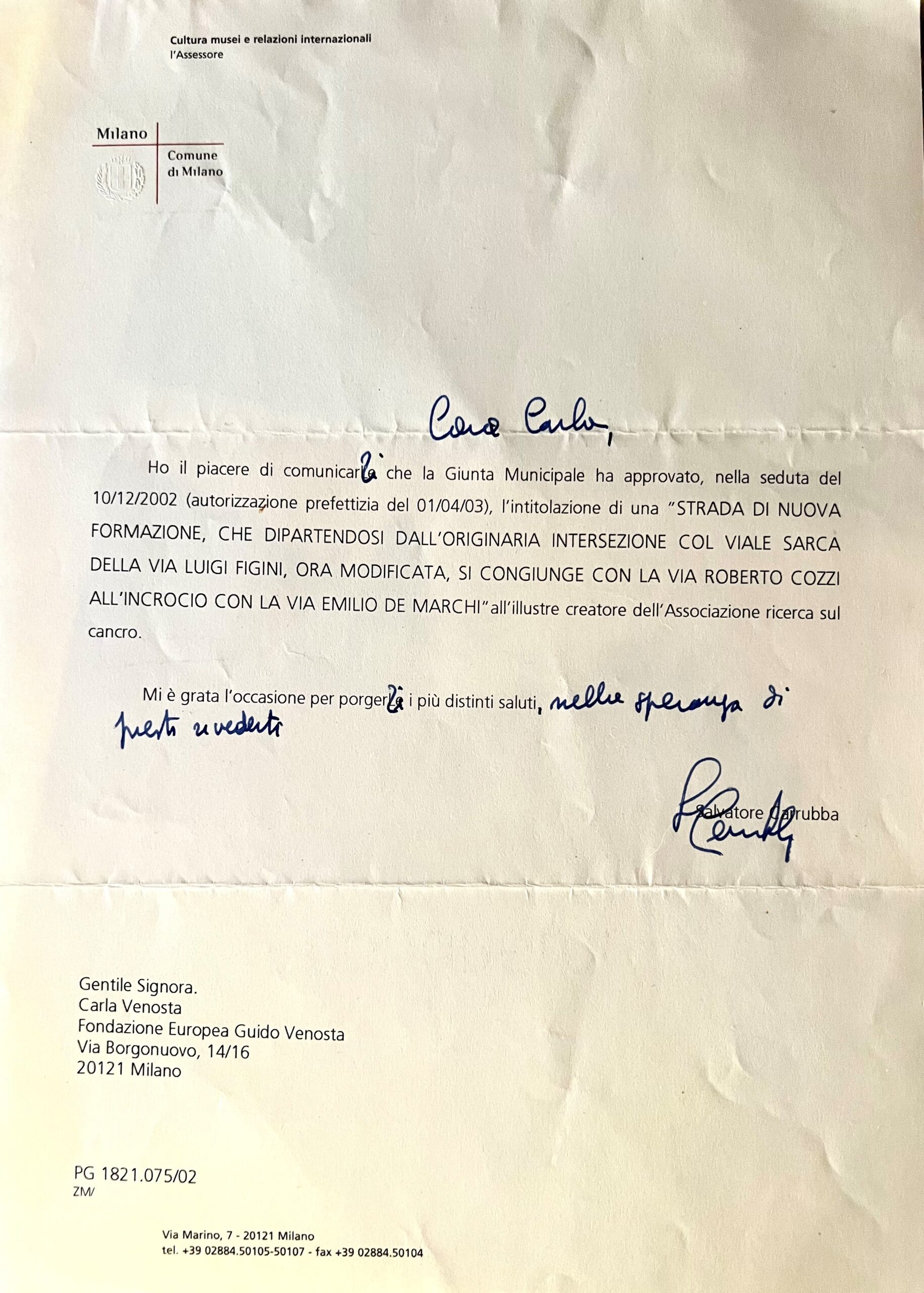 A street was dedicated to Guido Venosta in Milan, a side street in viale Sarca: the plaque recalls his role as a ‘pioneer of the non-profit sector‘, and the councillor for culture, museums and international relations Salvatore Carrubba, in informing Carla Venosta of the municipality’s approval, wrote that the municipal council, in its resolution of 10 December 2002, would name a street after the ‘illustrious creator of the Cancer Research Association’.