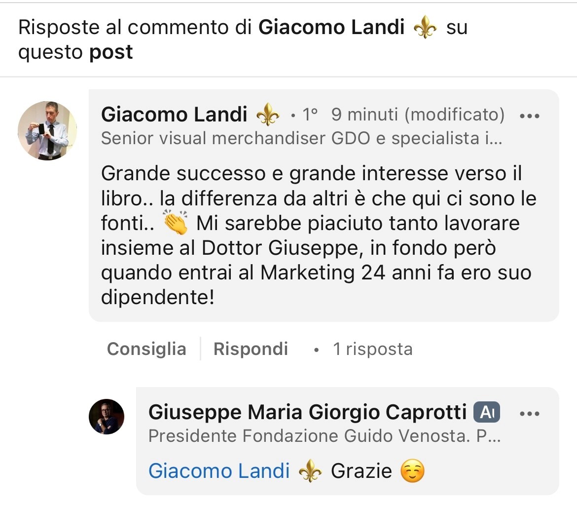 MS: Giuseppe Maria Giorgio Caprotti I am interested in everything related to your presence as a manager in the company, the reactions, the presence of the two ‘fathers’ and the repercussions on the company and the protagonists today. With all the limitations of an outside observer. The story involves me just the right amount.