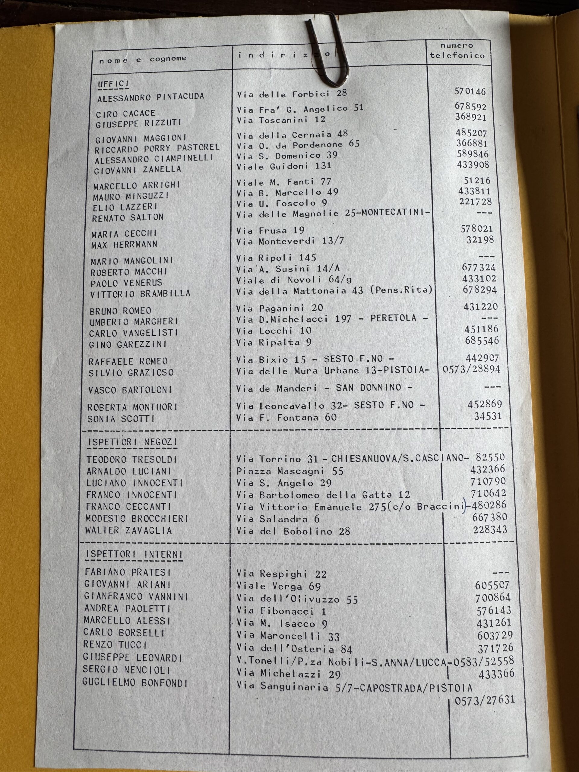 The Florentine ‘sorting’ nevertheless produced results that amazed the American journalist in 1968, the ‘prodigies’ of the golden boy of Supermarkets: ‘he opened two more supermarkets, bringing to a total of seven the number of shops serving the cities of Florence, Lucca and Pistoia. Under his leadership, another new supermarket, currently nearing completion, will be opened in Prato, in time for Christmas. Claudio Caprotti also plans to open two more shops in Florence in the near future, and also in Bologna, Pisa and Livorno’: at the time of the interview, his uncle was only thirty years old. He didn’t do it all by himself, of course, the layout of the shops is still heavily influenced by the strictly hierarchical, ‘Marines-like’ organisation of the Americans (even in 1972, internal documentation was written in English); but as head of the Tuscan area, he has achieved a series of not insignificant successes. And among those who collaborated with him at the time, I met and in turn collaborated with many, of whom I have fond memories and have found listed in a document transcribed below: