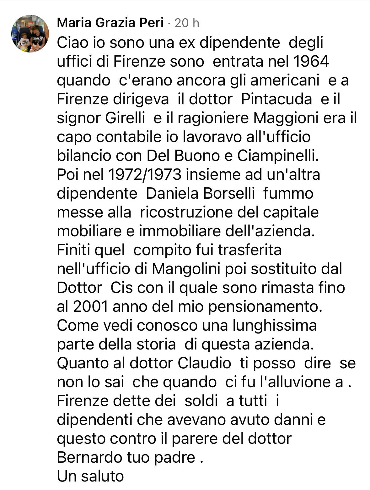 “Hello, I am a former employee of the Florence offices, I joined in 1964 when there were still Americans and Florence was run by Dr. Pintacuda, Mr. Girelli and accountant Maggioni, chief accountant. I worked in the budget office with Del Buono and Ciampinelli. Then in 1972/1973, together with another employee, Daniela Borselli, we were put in charge of reconstructing the company’s movable and immovable capital. When that task was finished, I was transferred to Mangolini’s office, later replaced by Dr Cis, with whom I remained until 2001, the year of my retirement. As you can see, I know a very long part of the history of this company. As for Dr Claudio, I can tell you, if you don’t know, that when there was a flood in Florence he gave money to all the employees who had suffered damage, and this against the advice of Dr Bernardo, your father. Best regards Maria Grazia Peri.”