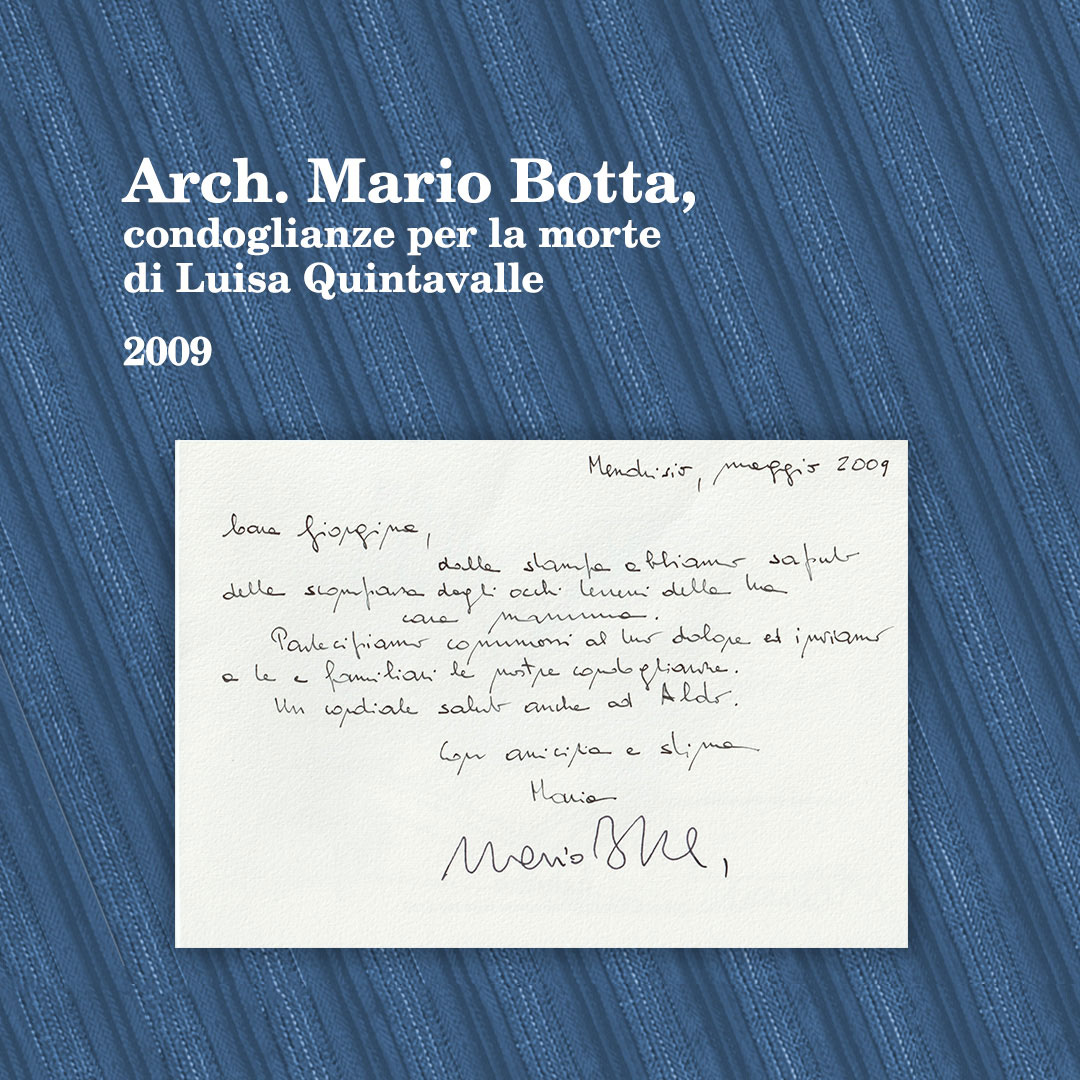 Ibid., Giorgina Venosta Archives, Architects, Mario Botta, Condolence card from Maria and Mario Botta to Giorgina Venosta on the death of their mother Luisa Quintavalle, Mendrisio (CH), May 2009 (unpublished).