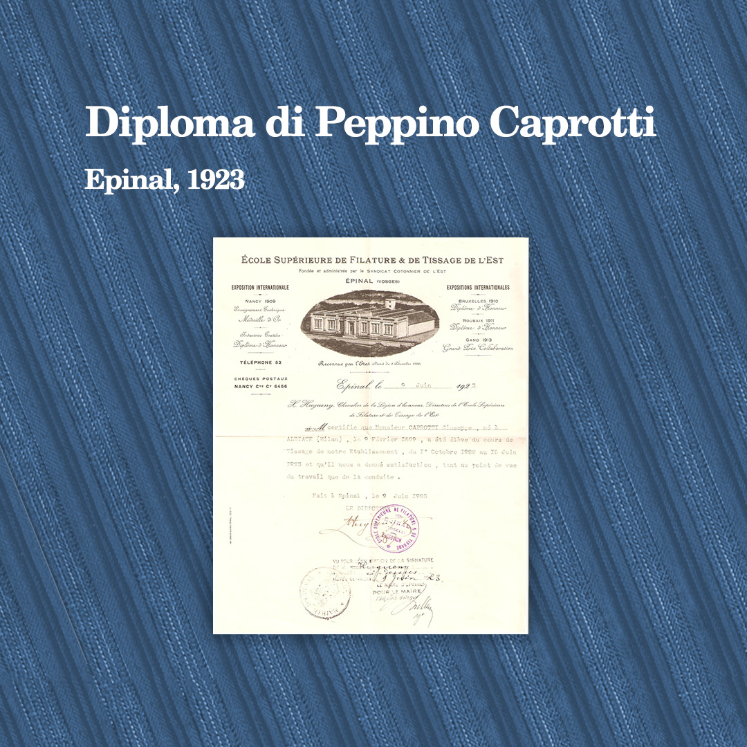Once the Great War was over and he was finally demobilised, grandfather Peppino, young and full of life, might have wished to spend more time enjoying himself, but his father, great-grandfather Bernardo, had other plans, and enrolled him in one of the best schools for training personnel and managers in textile manufacturing, as he too was to join the family business in Albiate, Manifattura Caprotti.