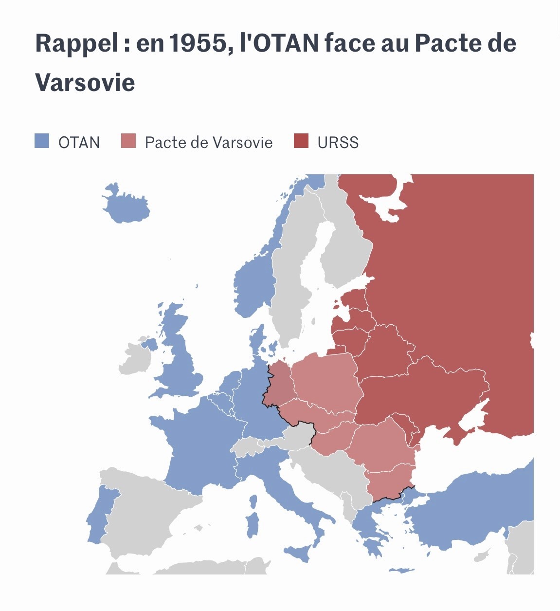 As a reminder, in the map below: 1955, NATO facing the Warsaw Pact