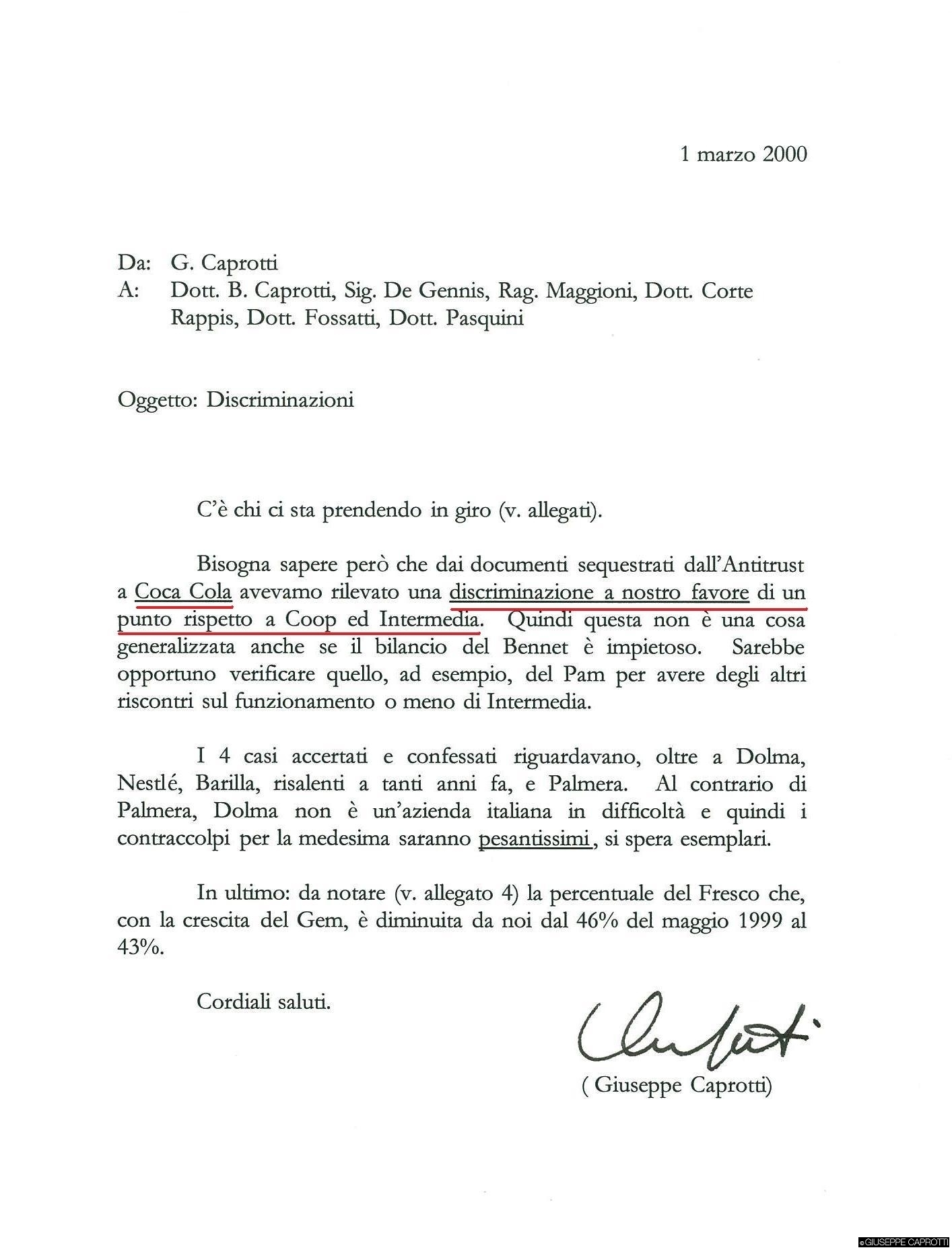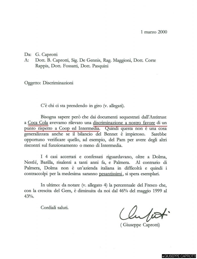 Questo fatto è confermato dalla mia lettera qui sotto riportata, nella quale spiego a mio padre e altri dirigenti Esselunga, che nel sequestro dei documenti presso la sede della Coca – Cola (la GDF, che esce sempre quando c’è una denuncia all’Antitrust, aveva preso i file di Enrico Nardulli, v. biglietto sopra), eravamo poi venuti a conoscenza del fatto che che Coca- Cola ci favoriva rispetto a Coop e alla nostra Centrale rivale Intermedia (dove, ad esempio, era presente la Pam) , dandoci 1 punto % in più di contributi sul fatturato!