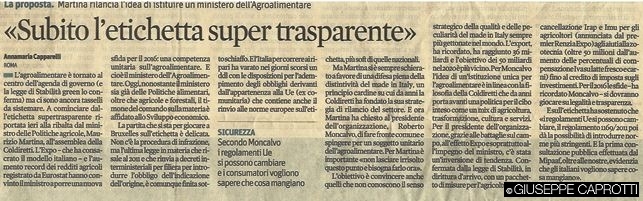 E il Ministro Maurizio Martina rilancia sull’etichettatura “super trasparente” (supponiamo con la provenienza precisa degli ingredienti, come vuole anche Paolo Di Castro)