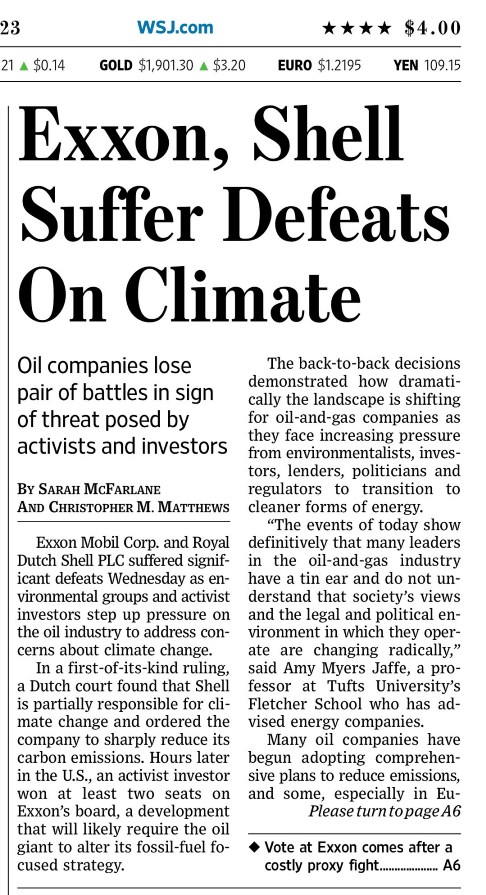 ma il Wall Street Journal , in prima pagina, parla sia di Shell che di Exxon, sotto attacco da tempo anche per la sua politica di greenwashing (*).