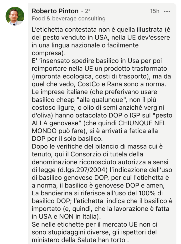 La vicenda può essere letta qui. Pinton, tecnicamente, ha ragione ma – come dice Pino Coletti – “puzza” : molti dei responsabili per quelli che vengono bollati con disprezzo dall’opinione pubblica come prodotti italian sounding sono da ricercare nel nostro paese, non all’estero. Basta guardare l’etichetta, dove viene evidenziato solo il basilico ligure (e nessun altro ingrediente). Il pesto è quindi a norma di legge ma fuorviante per i consumatori. Da notare l’iniziativa greenwashing di Barilla.