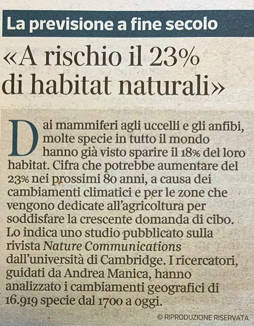 Il 18% sono già spariti. A rischio un altro 23% nei prossimi 80 anni “a causa dei cambiamenti climatici e per le zone che vengono dedicate all’agricoltura per soddisfare la crescente domanda di cibo”. Corriere della Sera del 7 novembre 2020
