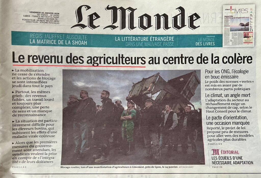 Il casello della A1 è stato riaperto dopo l’occupazione da parte dei manifestanti con 60 trattori. Le contestazioni prendono di mira la politica europea, in particolare la riforma agraria europea del nuovo ‘Green Deal’ RaiNews. Sicuramente il “Green Deal” da fastidio agli agricoltori ma gli agricoltori sono arrabbiati anche per il forte aumento delle tasse, evidenziato dall’opposizione, e dal loro reddito (la questione è risaputa ma ignorata da chi potrebbe risolverla – governo e Coldiretti) . Sotto su Le Monde : revenu des agriculteurs = reddito degli agricoltori.