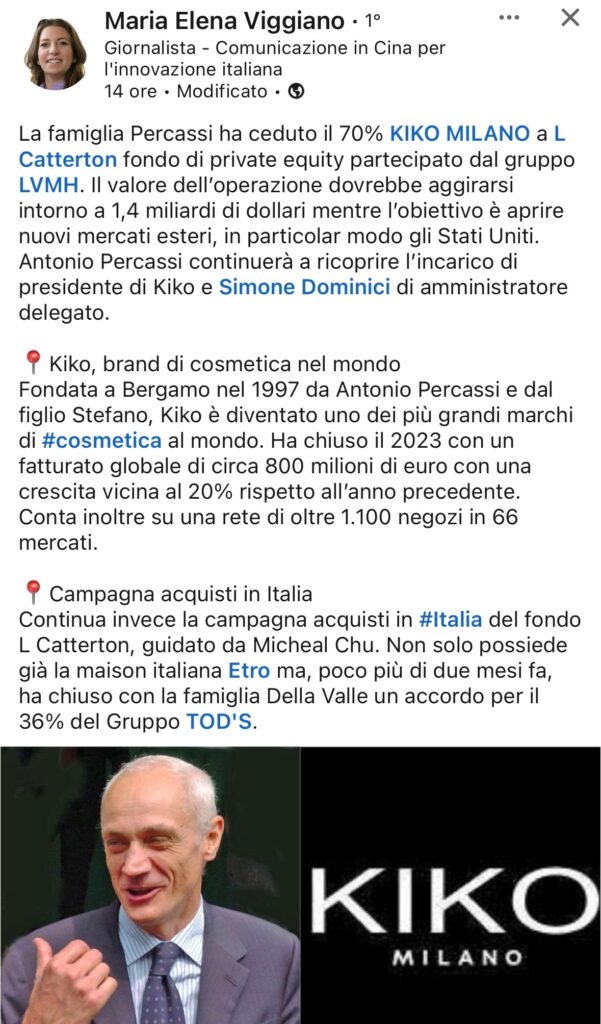 Ansa. KIKO, il cui fatturato è aumentato del 20% lo scorso anno a circa 800 milioni di euro, gestisce più di 1.100 negozi in 66 paesi. Su Percassi leggi questo articolo, datato ma interessante: non si può fare “tutto” bene: Starbucks, Kiko, i centri commerciali e tanto altro ancora, a meno di non chiamarsi Bernard Arnault, sul cui impero – LMVH – “non tramonta mai il sole”.