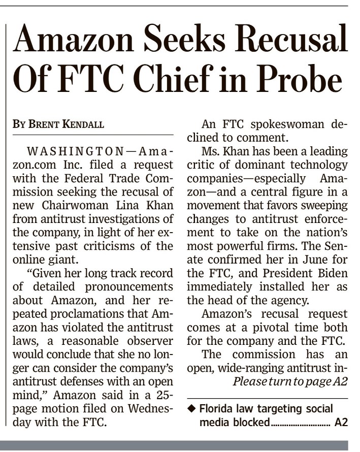 e chiede che venga tolto il suo dossier al nuovo presidente Lina Khan.