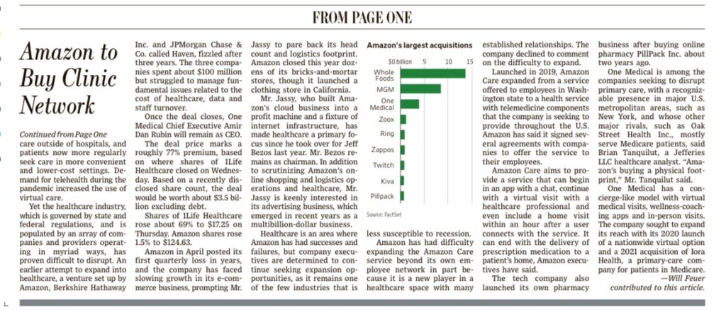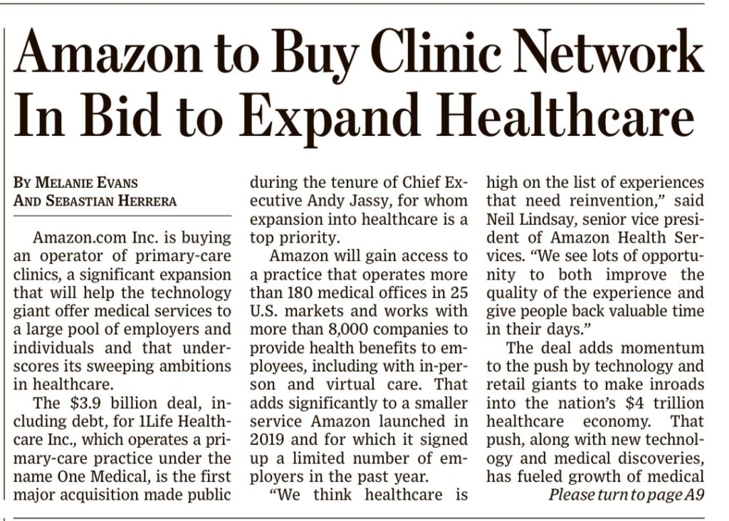 One Medical ha un modello che comprende visite virtuali, controlli via app e visite in persona. Il mercato dovrebbe valere 4’000 miliardi di $ negli USA. L’acquisizione è voluta da Andy Jassy, il successore di Jeff Bezos e protagonista di Amazon Web Services, il business cloud di Amazon. Nel 2019 era stata fondata Amazon Care che ha un modello di business simile a One Medical . Wall Street Journal 22 luglio 2022 e Corriere della Sera