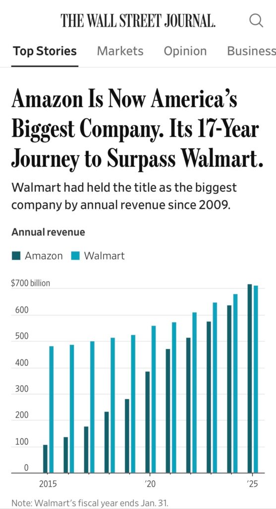 Walmart aveva detenuto il titolo di più grande società per fatturato annuo dal 2009… Walmart ha avuto $ 713,2 miliardi di vendite nell’anno fino al 31 gennaio, rispetto ai $ 716,9 miliardi di Amazon per il suo ultimo anno