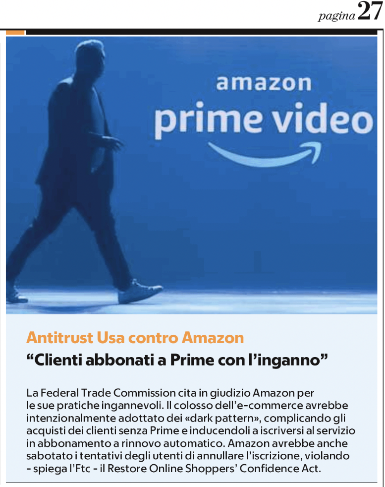 Le commissioni di abbonamento Prime rappresentano $ 25 miliardi delle entrate annuali di Amazon, secondo la denuncia. L’anno scorso le entrate della società hanno raggiunto $ 514 miliardi. Secondo Insider Intelligence, gli utenti di Amazon Prime negli Stati Uniti sono destinati a raggiungere 174,9 milioni quest’anno, rappresentando circa il 66% della popolazione statunitense. Sulla Federal Trade Commission leggi qui