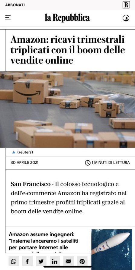 “Trimestrale migliore delle attese per Amazon: grazie al boom delle vendite on line, ulteriore conseguenza della vita in lockdown a causa della pandemia. Il colosso delle vendite e consegne a domicilio ha registrato un utile per azione di 15,79 dollari: questo significa che da gennaio a marzo, la società fondata da Jeff Bezos ha avuto profitti per 8,1 miliardi, triplicati rispetto allo stesso periodo dell’anno scorso.