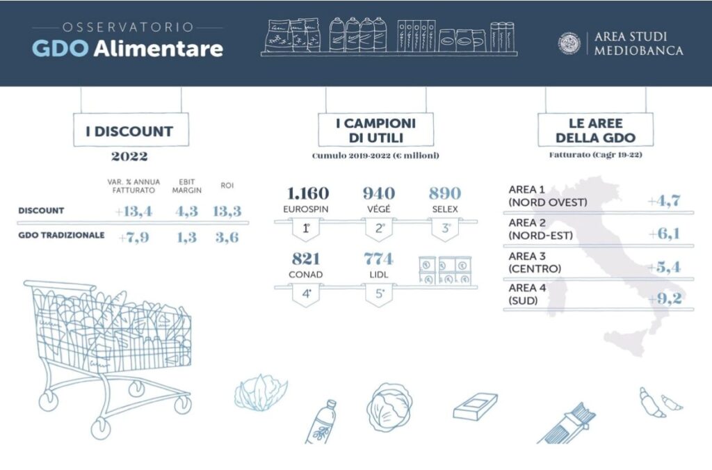 La quota di mercato di discount è passata dal 18,9% del 2019 al 23% del 2023. Il prestito soci del sistema Coop segna un’ulteriore decrescita dagli 8 miliardi del 2019 ai 7,7 miliardi del 2022. Fonte. La sfida più grande si gioca sui margini, da difendere a fronte di una congiuntura economica non proprio brillante. Con i discount che negli ultimi anni si sono mostrati più abili nel fornire risposte adeguate alle tasche dei consumatori svuotate dall’inflazione:… tra il 2019 e il 2022, le vendite sono aumentate del 20,4% con un tasso medio annuo del 6,4%. Mentre l’ebit margin (indicatore dell’attività caratteristica rispetto al fatturato) nell’ultimo anno considerato è sceso all’1,9% dal 2,2% del 2021, dopo aver raggiunto il picco nel 2020 (2,6%).