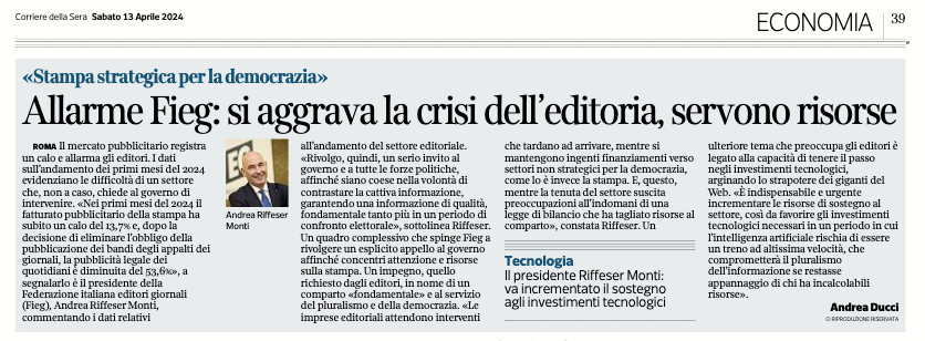 Sotto : “Nei primi mesi del 2024 il fatturato pubblicitario ha subito un calo del 13,7%” (Corriere della Sera del 13 aprile 2024).