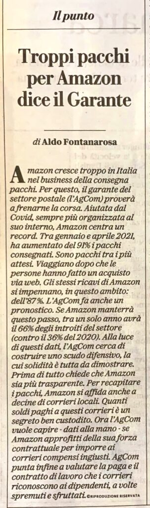 AgCom : 66% dei pacchi spediti in Italia nel 2022 lo saranno da parte di Amazon (anche tramite corrieri). Repubblica 31 agosto 2021