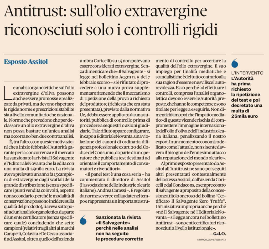 Sarebbe interessante che Assitol facesse fare dei test sull’olio extra vergine di oliva e li rendesse pubblici.