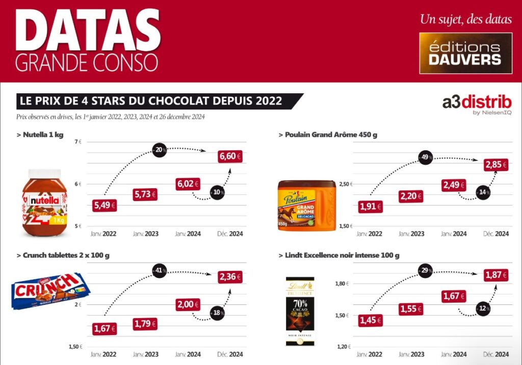 Sotto: la lavorazione delle fave di cacao e gli incrementi dei prezzi dal 2022 al 2024 di 4 articoli di Ferrero, Nestlè, Poulain e Lindt in Francia.