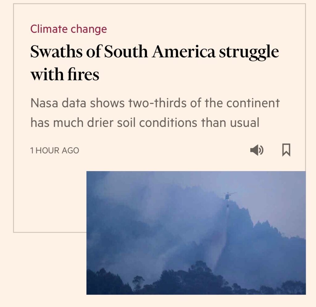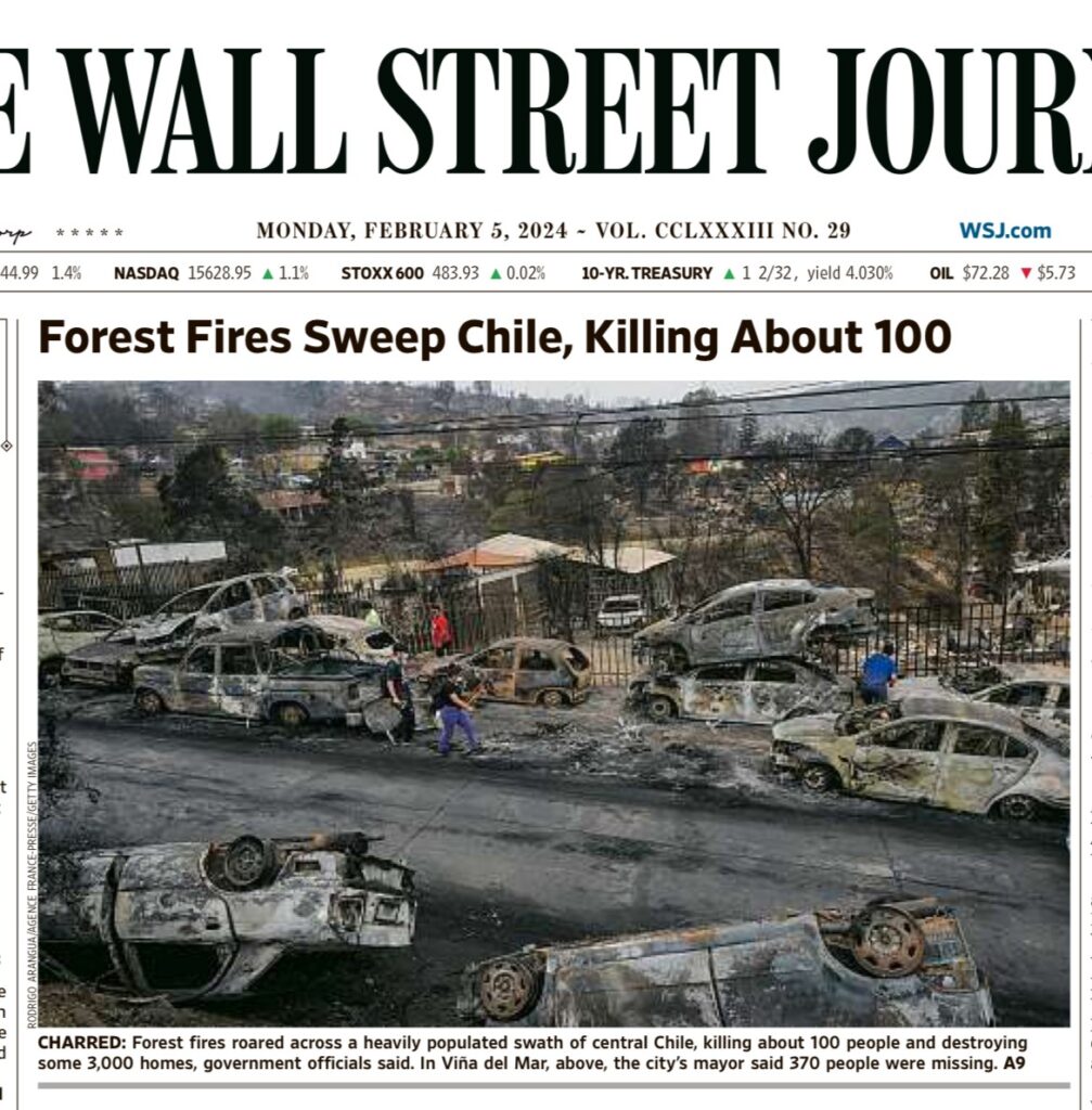 Due terzi del continente ha suolo più secco del solito (Financial Times su dati NASA). In Cile muoiono 100 persone per un incendio (WSJ)
