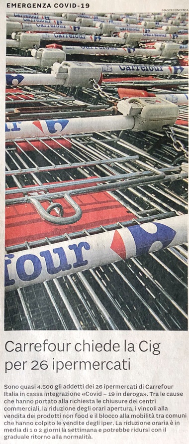 “Tra le cause …: la riduzione degli orari, i vincoli alla vendita dei prodotti non food e il blocco di mobilità tra comuni che hanno colpito le vendite degli iper”. Il Sole 24 ore del 24 aprile 2020 (vedi sotto).