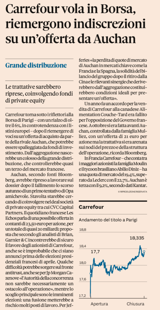 a 23,5 € ad azione. Possibile il coinvolgimento di CVC Capital Partners. Il Sole 24 ore del 7 gennaio 2022