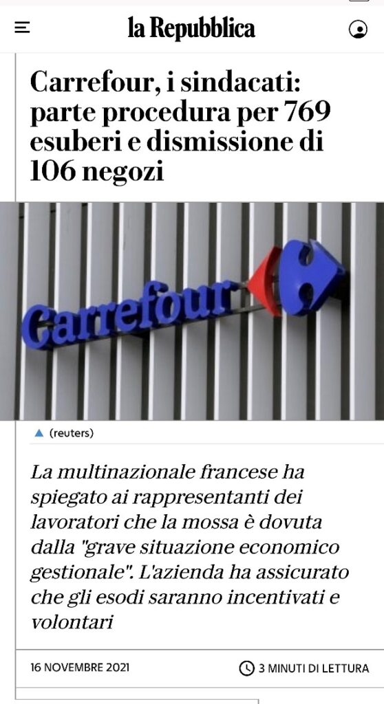 Carrefour, i sindacati: parte procedura per 769 esuberi e dismissione di 106 negozi