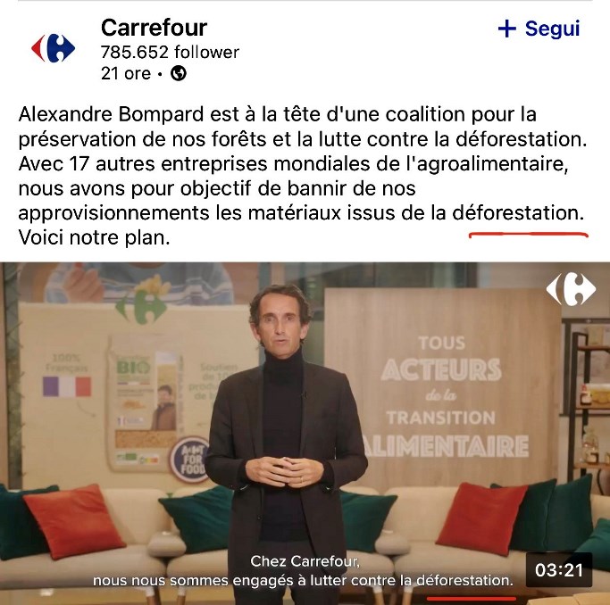 Carrefour è sotto attacco, come Casino, per gli acquisti di carne brasiliana, non monitorata e che contribuirebbe alla deforestazione dell’Amazzonia.