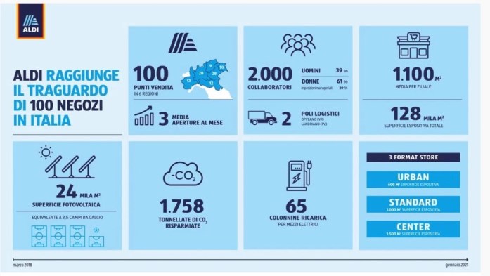 Con una media di tre inaugurazioni al mese Aldi ha sviluppato una rete con 100 negozi con una superfice media di 1.100 metri quadri. La multinazionale tedesca è attiva con tre format di vendita (urban, standard e center) nel segmento discount, ha oltre 2mila occupati e una presenza ben radicata nel Nord Italia il gruppo conta anche su due poli logistici, a Oppeano, in provincia di Verona, e Landriano, nel pavese. L’80% dei prodotti venduti è made in Italy. Il Sole 24 ore 26 gennaio 2021