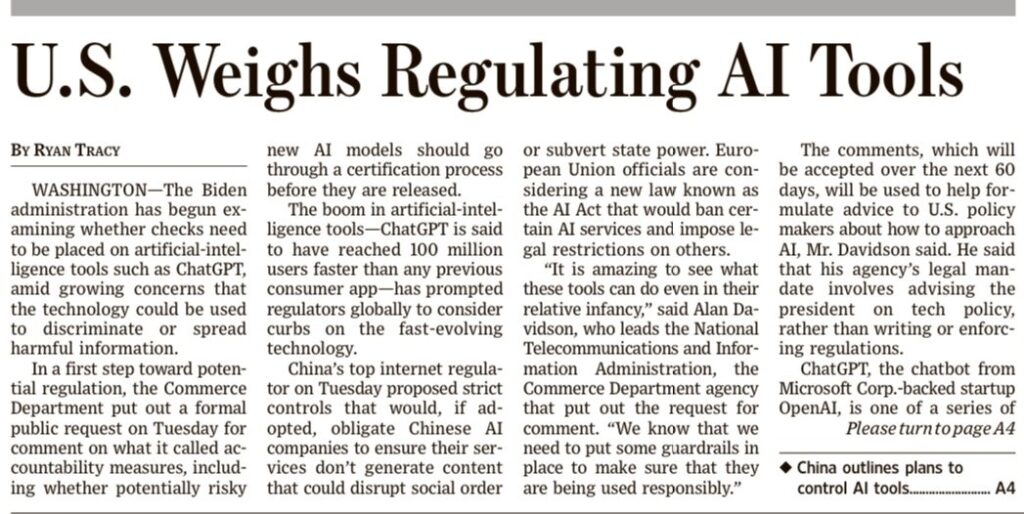 WSJ 12 aprile 2023. Madrid invoca l’intervento del Garante della privacy UE (Repubblica 12 aprile 2023) e Alibaba ha lanciato il suo format dichatbot (varie testate). Sull’argomento leggi