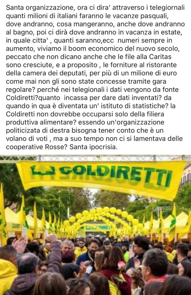 Della vicenda avevamo già parlato qui. Della Sicilia abbiamo parlato a più riprese. Giudicate voi se un’organizzazione di questo genere, con tutte le cose che ci sarebbero da fare, debba perdere tempo in questa disputa : Coldiretti, attacco a Mediterranea a pagina intera (1): “Ci sono dietro colossi del cibo omologato”. Sotto : un post polemico su “Santa Coldiretti”