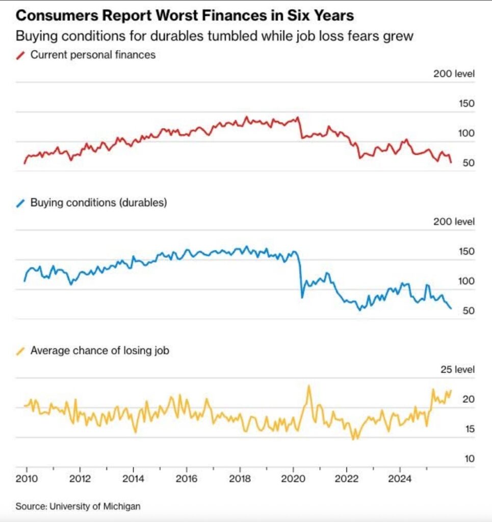 Gli ultimi indicatori dell’Università del Michigan – da Bloomberg – non sono positivi : risparmi e possibilità di comprare beni durevoli in decremento e aspettative di perdere il lavoro in rialzo.
