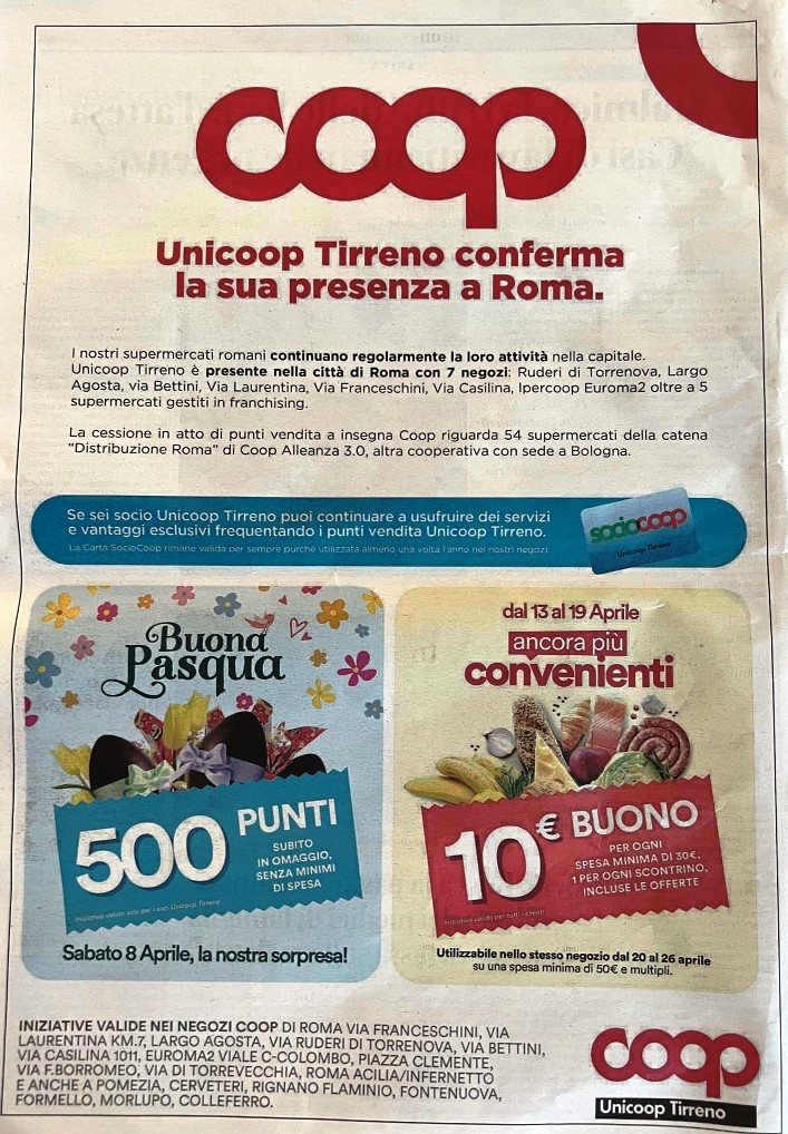 Sotto la “smentita” di Unicoop Tirreno che manterrà 7 pdv a Roma: la toppa – che dimostra che la Coop è disunita e che la centrale Coop Italia conta poco o nulla – peggio del buco. Pubblicato il 3 aprile, aggiornato il 6 aprile 2023