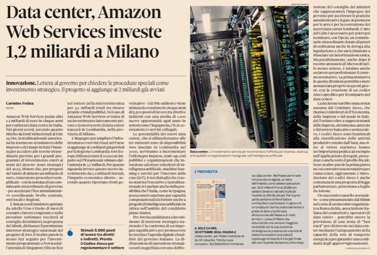Data center : Amazon Web Services investe 1,2 miliardi a Milano