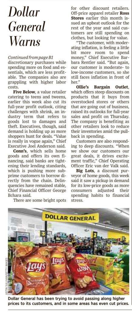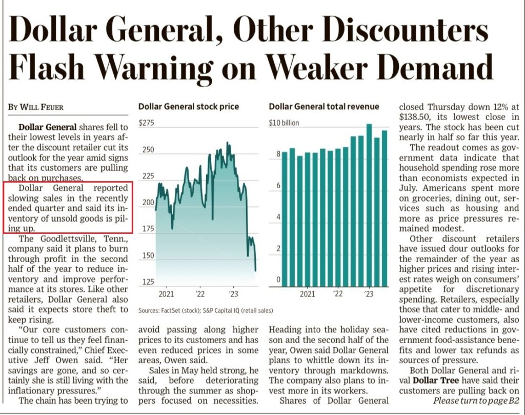 Dollar Gereral aggiunge che gli inventari invenduti crescono. Wall Street Journal 1° settembre 2023. Ne abbiamo già parlato.