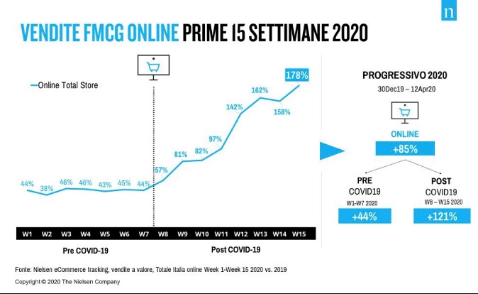 Nell’ultima settimana, terminante il 12 aprile 2020, si è toccato il picco di una crescita pari al + 178% con un + 85% progressivo, dall’inizio dell’anno. Nielsen